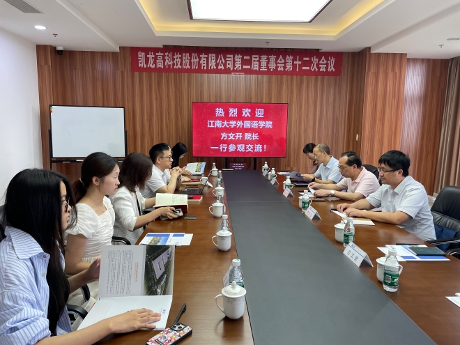 凯龙高科技股份有限公司副总经理、技术研究院院长刘德文,技术研究院副院长周颖,外贸业务部经理欧小娟参加座谈交流会。首先,江南在线学院一行参观了企业展厅。座谈会现场,刘德文介绍了公司的发展历程、主要产品、招聘情况等内容,他表示,企业一直在拓展海外业务,需要高素质语言人才,期待与江南在线学院在实习就业、人才培养等方面展开合作。方文开介绍了学院的师资力量、学科建设、人才培养等基本情况,他表示,学院人才培养离不开企业的支持,希望以本次访企拓岗为契机,双方携手开启共赢共发展的新局面。季王飞介绍了学院2025届毕业生就业情况,欧小娟介绍了公司海外业务发展情况。在交流环节,大家围绕“实习工作”、“招聘要求”、“人才培养”等方面积极发言。