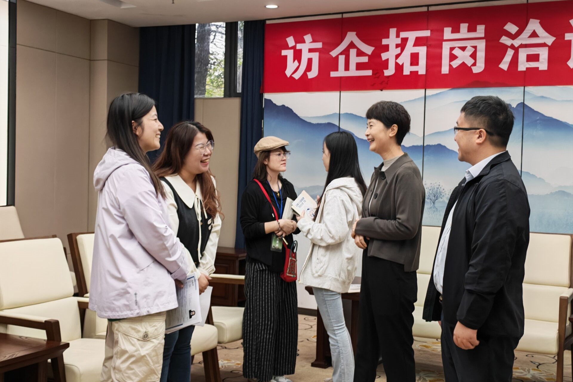 招聘会当天,江南在线学院党委书记李荣华,党委副书记、副院长季王飞,班主任许兰娟、李建及辅导员朱家烨深入会场,化身“求职推荐官”,重点走访苏美达、江苏国泰等25家企业,详细介绍学院专业设置、人才培养特色及2026届毕业生情况,并将55份学生简历亲自递交给相关用人单位。此外,学院还精心准备了包含生源信息的“能量包”,助力企业更全面了解外院学子。