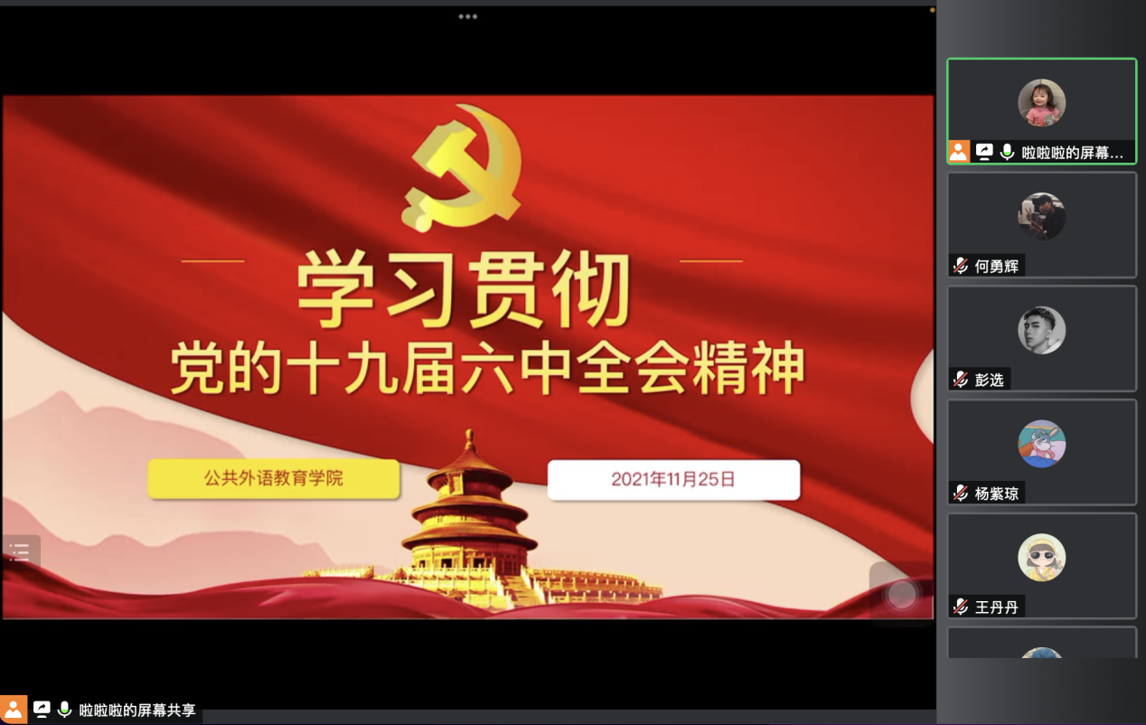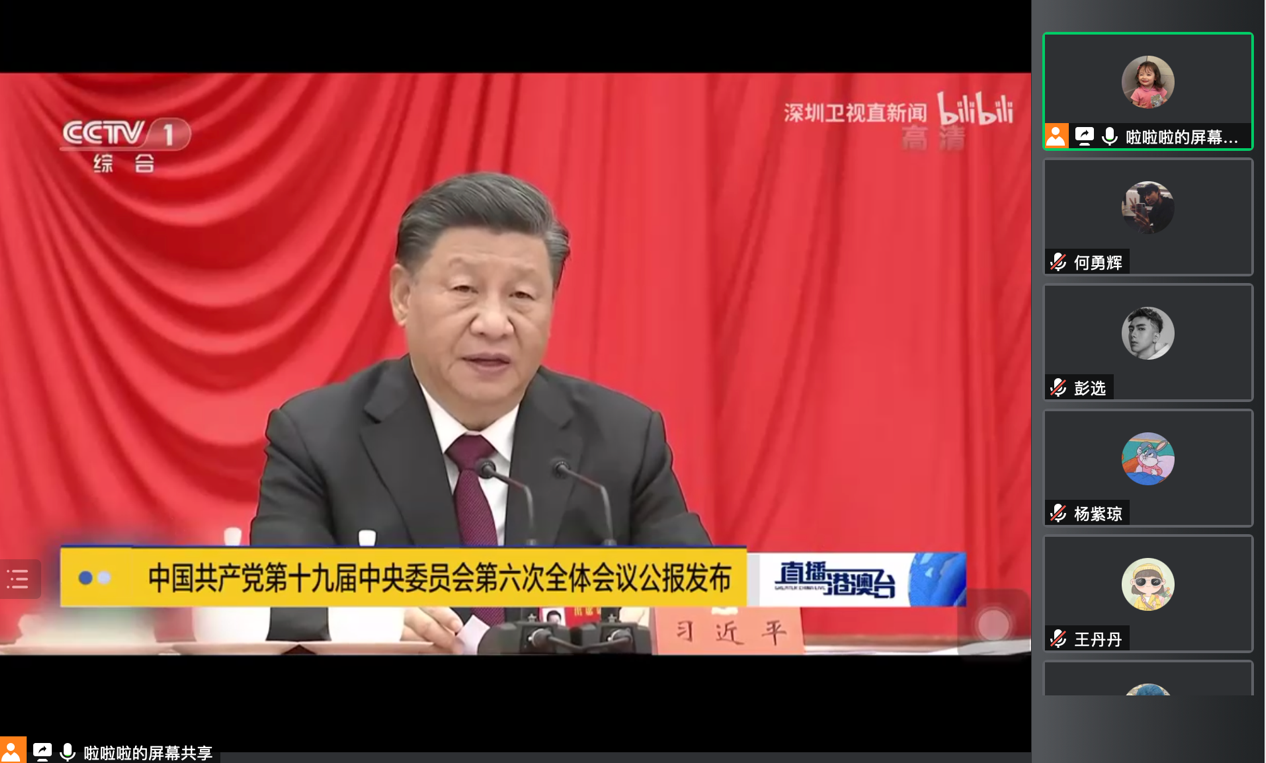 为深入学习贯彻党的十九届六中全会精神,深刻理解党百年奋斗的历史经验,深化学生干部爱党情怀,【官网】研究生会组织开展了“学习十九届六中全会精神”活动。2021年11月25日下午,【官网】研究生会全体成员以线上会议的形式,学习了十九届六中全会精神。本次会议由院研究生会主席曲哲主持,研究生会全体学生干部参与学习。