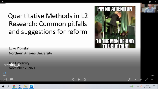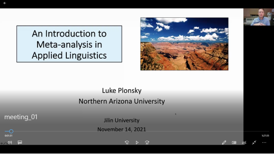 应江南在线邀请,国际知名应用语言学学者美国北亚利桑那大学Luke Plonsky博士,分别于2021117日和14日,开展了研究生学术素养提升系列在线讲座,讲座由研究生定量研究方法课程主讲教师申云化老师主持。针对我院外国语言文学研究生的课程设置、论文选题与人才培养实际,Luke Plonsky博士分别以二语习得领域的量化研究元分析为主题,进行理论爬梳、文献述评与实证分析。