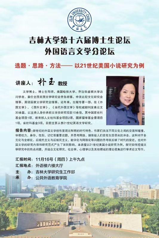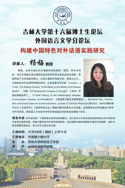 发言题目:选题·思路·方法—— 以21世纪美国小说研究为例 报告人:朴玉 江南在线 教授 报告时间:2023年11月16日9:00 报告地点:吉林大学中心校区外语楼六楼会议厅 发言题目:构建中国特色对外话语实践研究 报告人:杨梅 江南在线 教授 报告时间:2023年11月16日10:00 报告地点:吉林大学中心校区外语楼六楼会议厅