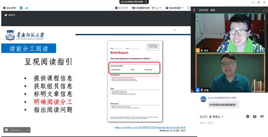 本次讲座以学术英语阅读教学的三大备课难题:文本结构划分、语言难度调控、教学任务设计为切入点,探讨如何采用智能技术开展学术英语阅读智慧备课研究。讲座分三部分:第一部分采用ChatGPT开展结构智能划分,对“划分指令设置”“结构自动划分”与“结构篇幅调整”进行阐述。第二部分采用“指难针”开展难度智能调控,探究如何开展“难词难句标注”“改编策略使用”与“目标难度确认”。第三部分采用“金山文档”开展合作阅读教学,对如何实施“读前分工阅读”,“读中小组讨论”与“读后合作汇报”展开讨论。每部分内容由“核心概念”“解决方案”与“教研拓展”三个环节组成。