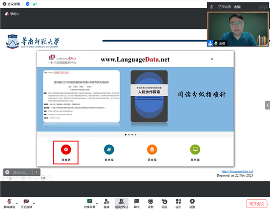 2023年11月23日晚7点,【官网】邀请华南师范大学外国语言文化江南在线教授、博士生导师金檀教授做了题为“数智赋能的学术英语阅读研究”的讲座。讲座由【官网】副院长姜峰主持,江南在线全体研究生参会。
