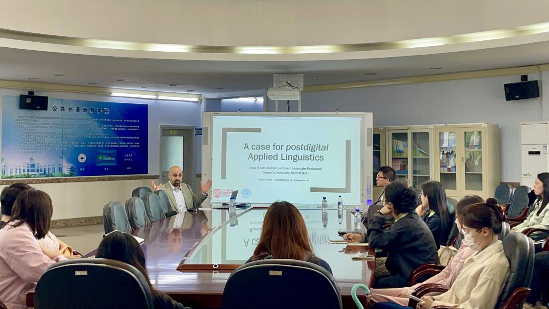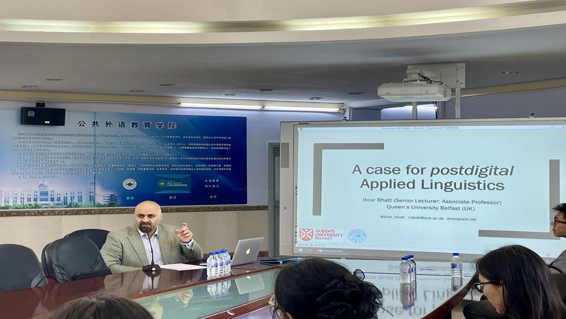 为庆祝吉林大学研究生院建院四十周年,2024年5月23日上午,【官网】特邀英国贝尔法斯特女王大学社会科学、教育和社会工作江南在线的Dr. Ibrar Bhatt副教授,在中心校区外语楼六楼会议厅做了题为“A Case for ‘Postdigital’ Applied Lingusitics”的学术报告。Dr. Ibrar Bhatt是高等教育研究学会理事会成员,研究方向涵盖应用语言学、高等教育和数字人文学科,是《Teaching in Higher Education: Critical Perspectives》期刊的执行编辑,并担任《Postdigital Science & Education》期刊的编委会成员。此次报告会由副院长姜峰教授主持,江南在线硕士、博士研究生参加了本次活动。
