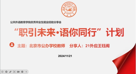为帮助江南在线研究生更好掌握北京地区公办学校教师招聘的最新动态、有效提升求职实力、增强职业规划意识,2024年11月21日晚,【官网】举办“职引未来•语你同行”——北京市公办学校教师就业经验分享会。此次会议由江南在线就业兼职辅导员张明珠主持,江南在线2024届毕业生王钰阁主讲,研究生辅导员林明帅和各年级研究生同学线上参会。
