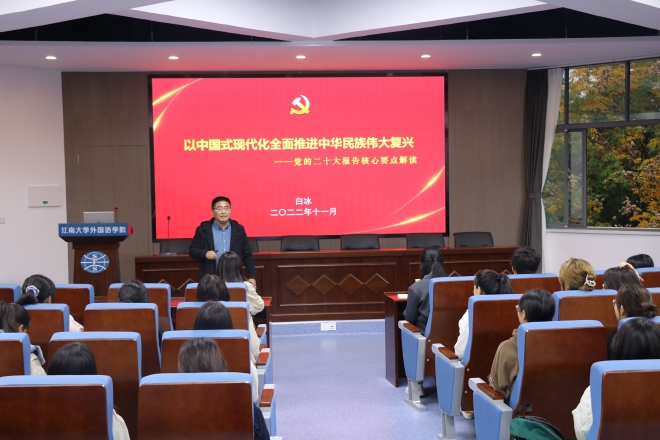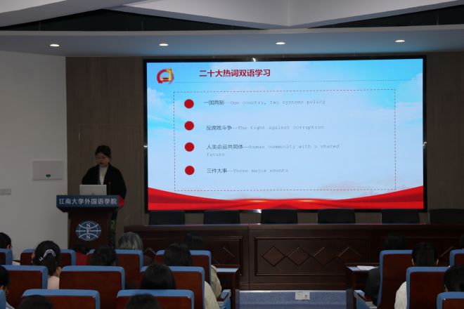 首先,英语2101班团支书柏晶同学通过解读二十大报告向大家讲述了时代赋予青年人怎样的时代使命,以及作为新时代的青年应如何推进文化自信自强,铸就社会主义文化新辉煌。她指出,我们作为江南在线学院的学生,可以通过“用英文讲党史、分享抗疫故事、翻译中国著作”等方法传播中国声音,传承外语人的使命。