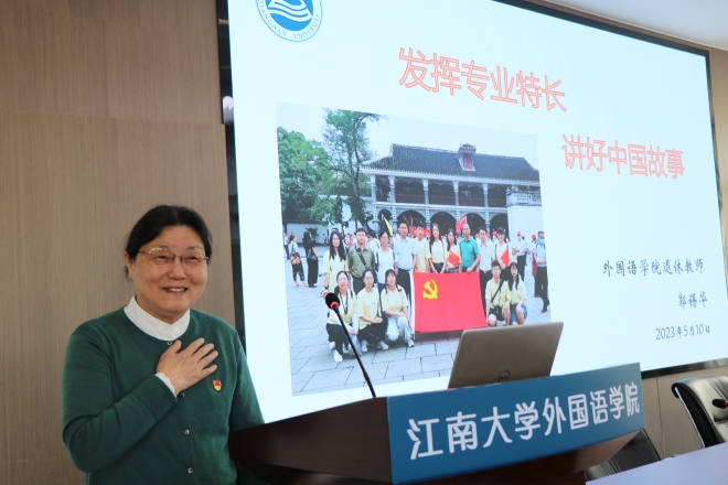 开班仪式后,由关工委委员郭锡华老师为学员带来专题第一讲《发挥专业特长,讲好中国故事》。郭老师结合习近平总书记给青年的寄语,分享了江南在线学院近年内发挥专业所长进行文化交流、讲好中国故事的实例。接着,又针对外语类专业适应社会发展的需要指明新文科背景下外语专业发展方向,提出抓专业质量的要求:一、优化专业结构;二、抓好质量标准;三、具备国际视野。郭老师鼓励学员们要树立远大理想,担当时代责任,与时俱进,锤炼自身能力,让青春在不断奉献中焕发光彩。