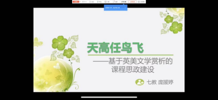 最后,大学英语第七教研室的庞援婷老师以“天高任鸟飞——基于英美文学赏析的课程思政建设“为题,以立德树人为关键词,从其核心、方式和根本三个方面进行了分享。首先,庞援婷老师阐释立德树人的核心即学生,树人的前提是了解人。因此,在备课之前做好”备学生“的工作至关重要,应当根据课型和学生的级别调制具体的教学目标和课程计划。第二,她将立德树人的方式归结为四个方面:学英语的兴趣和方式、知识面的扩展和延伸、文化的区别和比较以及性格的塑造和启发,并以自己的课程设计为例,分别展示了四种方式的具体实践过程,展现了深厚的学科素养与思政建设的体系性。第三,庞老师认为,立德树人的根本在于教师。抛开课型与学生需求的多样性,如果教师能始终从立德树人的立场出发,深刻铭记目标,切实思考,并基于思考去构建优化课程,不忘自我提升、终身学习,在课堂与生活中起到标杆作用,实现榜样的力量,才是立德树人的根本。