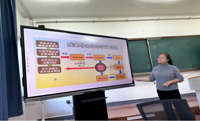 首先由课程团队负责人陈琳老师从OBE模式下的课程整体设计进行了汇报。她首先介绍了0BE模式的基本概念内涵以及其在高等教育领域日渐兴起的趋势,然后从课程目标设计和教学活动两大方面进行讲解和示例。她指出,基于OBE模式,教学目标的设计应依据产出成果反向设计,避免过于宏观或微观。之后,陈琳老师结合中国文化的英文表达课程,展示了OBE模式下如何设计多样化的教学活动,并介绍了具体的方法,流程以及评估方式。
