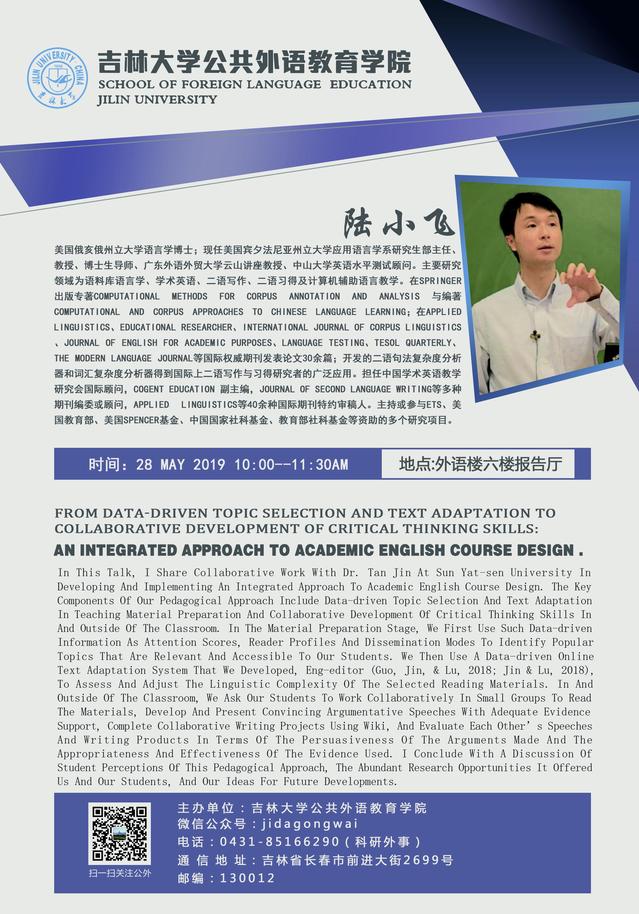 题目:From data-driven topic selection and text adaptation to collaborative development of critical thinking skills: An integrated approach to academic English course design 时间:2019年5月28日 10:00---11:30报告人:Xiaofei Lu, The Pennsylvania State University