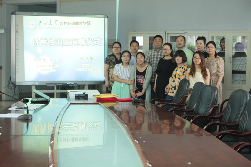 2015年5月26日上午10:00,【官网】优秀贫困生捐赠仪式在吉林大学外语楼六楼会议室举行。出席本次仪式的有四平建跃机械零部件有限责任公司总经理张跃斌先生、裴剑虹女士、【官网】的刘鸿雁老师、【官网】党委书记郝贺、行政副院长周晓宇、教科研办公室李欣霜及五名受资助贫困生。会议由郝贺书记主持。