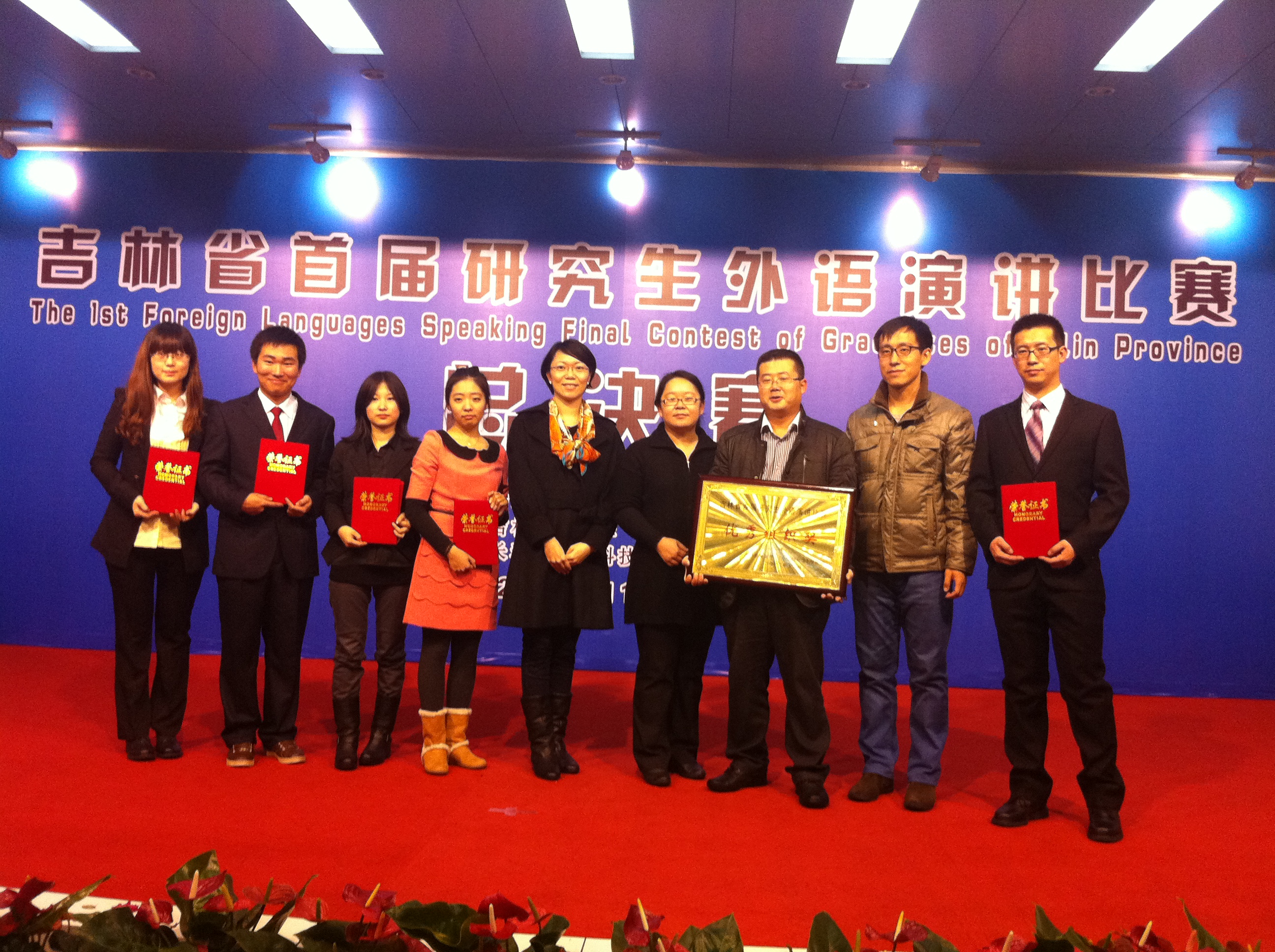 我校共派出9名选手,与来自东北师范大学、吉林农业大学、吉林师范大学、长春理工大学、吉林财经大学等13所高校的38名选手同台竞技。上午8点30分,省教育厅领导、《中国研究生》杂志社领导及吉林农业大学领导为大赛致开幕词,随后比赛正式拉开帷幕。 专业组决赛分即席演讲和现场问答两部分。我校选手以流利的口语、独特的见解及机智的回答征服了在场评委。2012级翻译硕士张倩同学以全场最高分91.34分的成绩获特等奖,2011级语言学硕士李伟同学获一等奖。非专业组决赛分自命题演讲和即席演讲两部分。2012级文江南在线王厚萱同学在激烈的争夺中表现出色,以第一名的成绩获特等奖。2011级机械江南在线周明星同学、2011级汽车工程江南在线赵帅同学获二等奖。2012级语言学硕士逄红等4名同学也以优秀的成绩和良好的表现荣获纪念奖。【官网】院长战菊教授被评为优秀指导教师,我校荣获优秀组织奖。 赛后,来自东北师范大学的 本项赛事受到我校研究生院有关领导的高度重视并给予了极大的支持,选手们在比赛中的突出表现集中体现了我校研究生外语教育的整体水平。本次大赛为更好地营造我校研究生外语教育氛围,建设研究生校园外语生活,深入实施研究生创新计划,全面提高研究生培养质量进行了更多积极有益的探索。