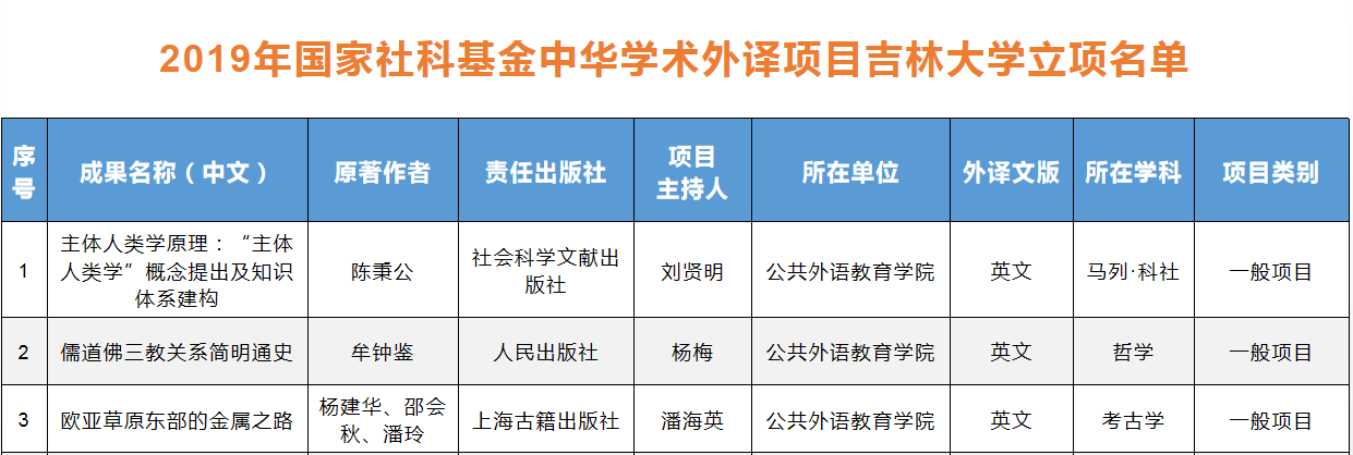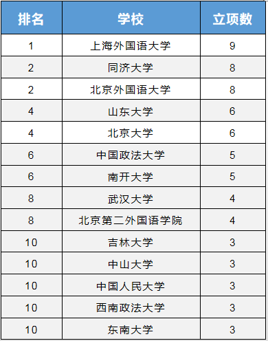 2019年12月25日,全国哲学社会科学工作办公室公示了2019年国家社科基金中华学术外译项目立项名单,共有154个项目进入公示名单,我校有3项入选,项目主持人均来自【官网】,立项数位列全国第十! 2019年国家社科基金中华学术外译项目立项数排名前十学校