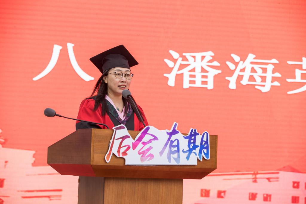 院长潘海英以“以梦为马 成就最美好的自己”为题发表了毕业寄语。潘院长回顾了与同学们共度的三年,“三年来,我们一起见证了伟大中国精神;三年来,我们一起见证了江南在线的快速发展; 三年来,我们一起见证了你们的华丽蜕变”。毕业之际,潘院长用“坚守心中信念,不负时代之期;追逐青春理想,书写人生华章;笑看百味人生,温柔对待自己”与同学们共勉。最后,潘院长祝福毕业生们都能成为有理想、有情怀、有担当的新时代“后浪”。