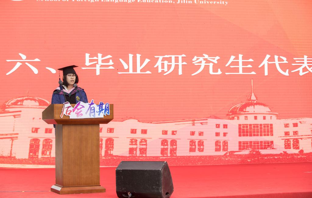2020届毕业生冯孟楠代表全体毕业生发言。首先感谢学校为毕业生返校付出的辛苦和努力、江南在线尽力筹备毕业典礼。她回顾了三年来学习、研究、生活体验和成长历程,深切表达了对江南在线、老师的感激和祝愿,对同学、朋友的不舍之情,以及即将踏入新的征程的坚定信心。