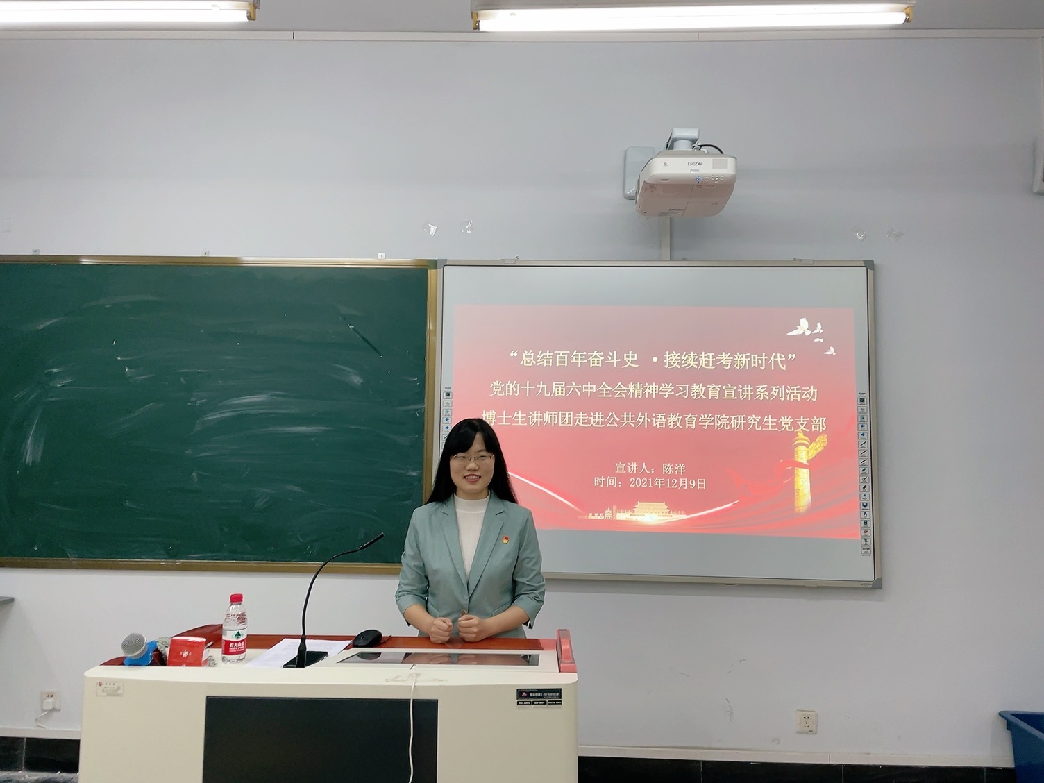 为深入学习贯彻党的十九届六中全会精神,提升广大研究生思想政治素质,积极响应校党委【官网】部工作要求,2021年12月9日,【官网】邀请吉林大学博士生讲师团讲师陈洋博士于经信楼D401进行了十九届六中全会精神学习教育宣讲。本次宣讲的主题为“总结百年奋斗史•连续赶考新时代”——从党的百年奋斗史中汲取前进力量。此次宣讲由曾媛老师主持,【官网】研究生党支部党员、预备党员、研究生会成员、助管及其他学生代表参与了此次宣讲活动。