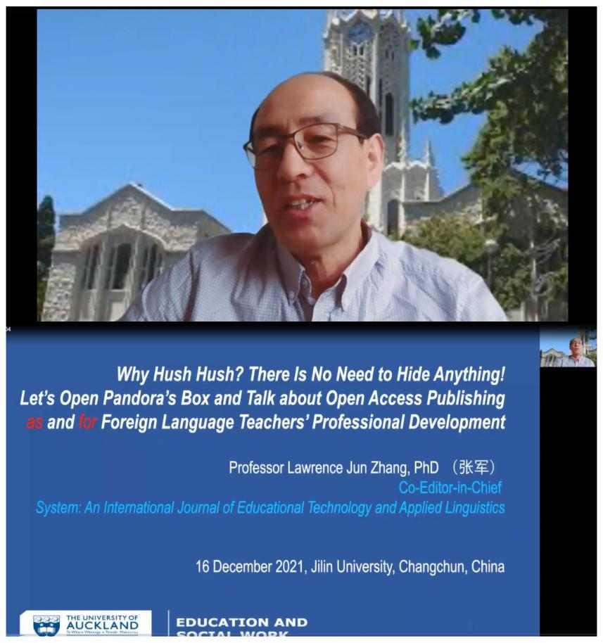 应【官网】邀请,国际知名应用语言学学者新西兰奥克兰大学Lawrence Jun Zhang(张军)教授于2021年12月16日举办题为“Why Hush Hush? There Is No Need to Hide Anything! Let’s Open Pandora’s Box and Talk about Open Access as andfor Foreign Language Teachers’ Professional Development”的专题线上学术讲座。该讲座为我院“新文科、新发展、新思考”庆祝吉林大学建校75周年外国语言文学系列讲座之一。讲座由徐志卿博士主持,院长潘海英教授、我院教师及研究生代表参加了本次讲座。
