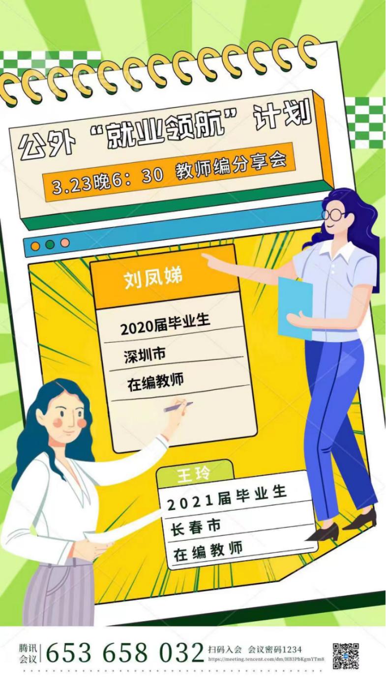 为进一步满足学生求职需求,搭建高效就业交流平台,【官网】于2022年03月23日通过腾讯会议线上举办“就业领航”计划——教师编方向专场分享会。此次分享会邀请到2020届毕业生代表刘凤娣、2021届毕业生代表王玲,结合各自考取深圳、长春等地教师编制的亲身经历,分享个人在考试、工作过程中的体会与收获。会议由研究生辅导员曾媛主持,2020级和2021级百余名同学共同参会。