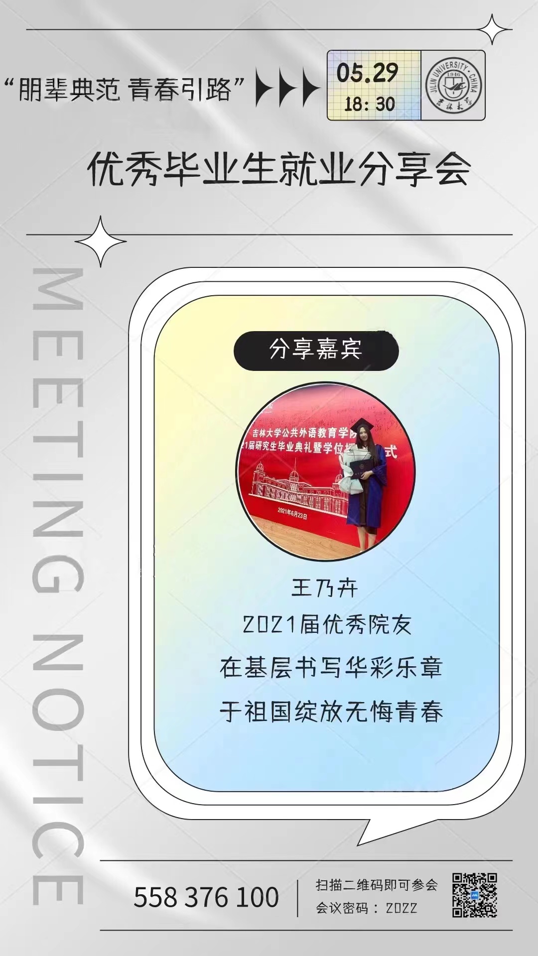 会议最后,曾媛老师表示,王乃卉是吉大递给祖国边境的名片,更是公外业广惟勤的代表。边境困苦,玉汝于成。希望今日的分享能为毕业生答疑解惑的同时,也为在校生的职业规划提供有价值性的参考。