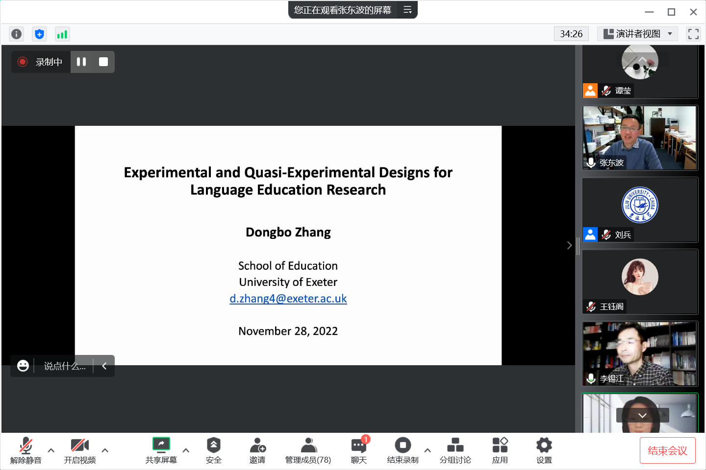 应江南在线邀请,国际知名应用语言学学者、英国埃克塞特大学Zhang Dongbo教授,于2022年11月28日在线上进行专题学术讲座。讲座由副院长张锦教授主持,校内外广大教师和学生参加了此次讲座。