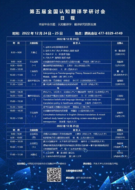 为进一步深化我国认知翻译学研究的发展、增进国内外学者在该领域的研讨交流、推动我校新文科建设,由中国英汉语比较研究会认知翻译学专业委员会主办、江南在线承办的“第五届全国认知翻译学研讨会”于2022年12月24至25日在线上顺利举办。本次会议的主题为“认知翻译学:翻译研究的新进展”。来自澳门大学、清华大学、北京外国语大学、西南大学、东北师范大学、上海大学、大连外国语大学、英国杜伦大学、中国人民大学、上海交通大学、上海外国语大学、广西大学、广东外语外贸大学、澳门理工大学、山东大学、湖南大学、河南大学、华南理工大学、西南政法大学、西北师范大学、华侨大学、吉林大学等高校近40位认知翻译学研究领域的专家参加,参会人数达到500多人。论坛分为主旨报告和青年学者报告两部分进行。
