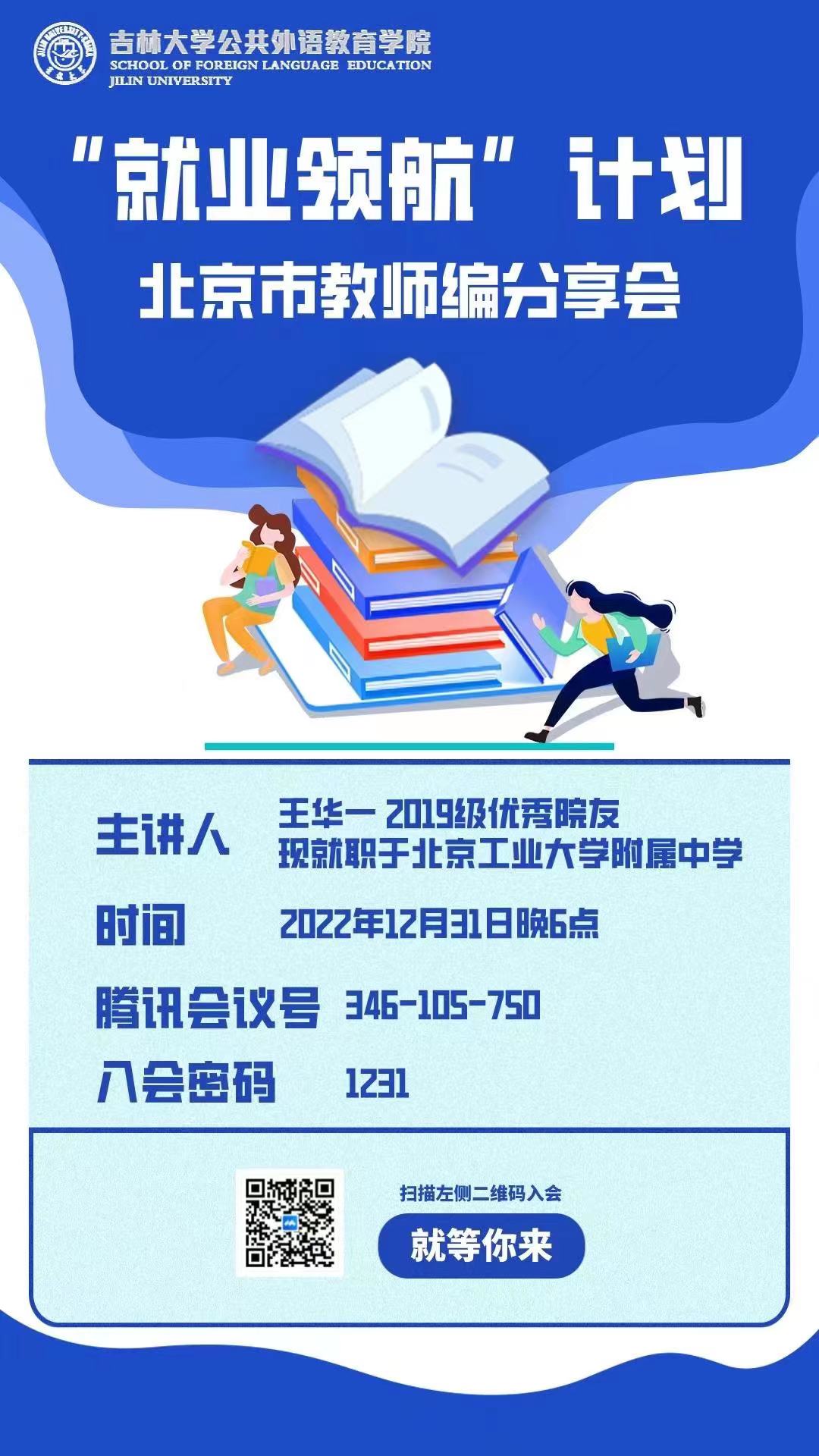 为发挥优秀毕业生模范带头作用,引导学生明确就业目标、制定就业计划规划,2022年12月31日晚6点,【官网】线上举办了北京市教师编分享会。此次分享会由辅导员曾媛主持,特邀请2019级优秀院友、现就职于北京工业大学附属中学王华一教师主讲,【官网】近百余名研究生参会。