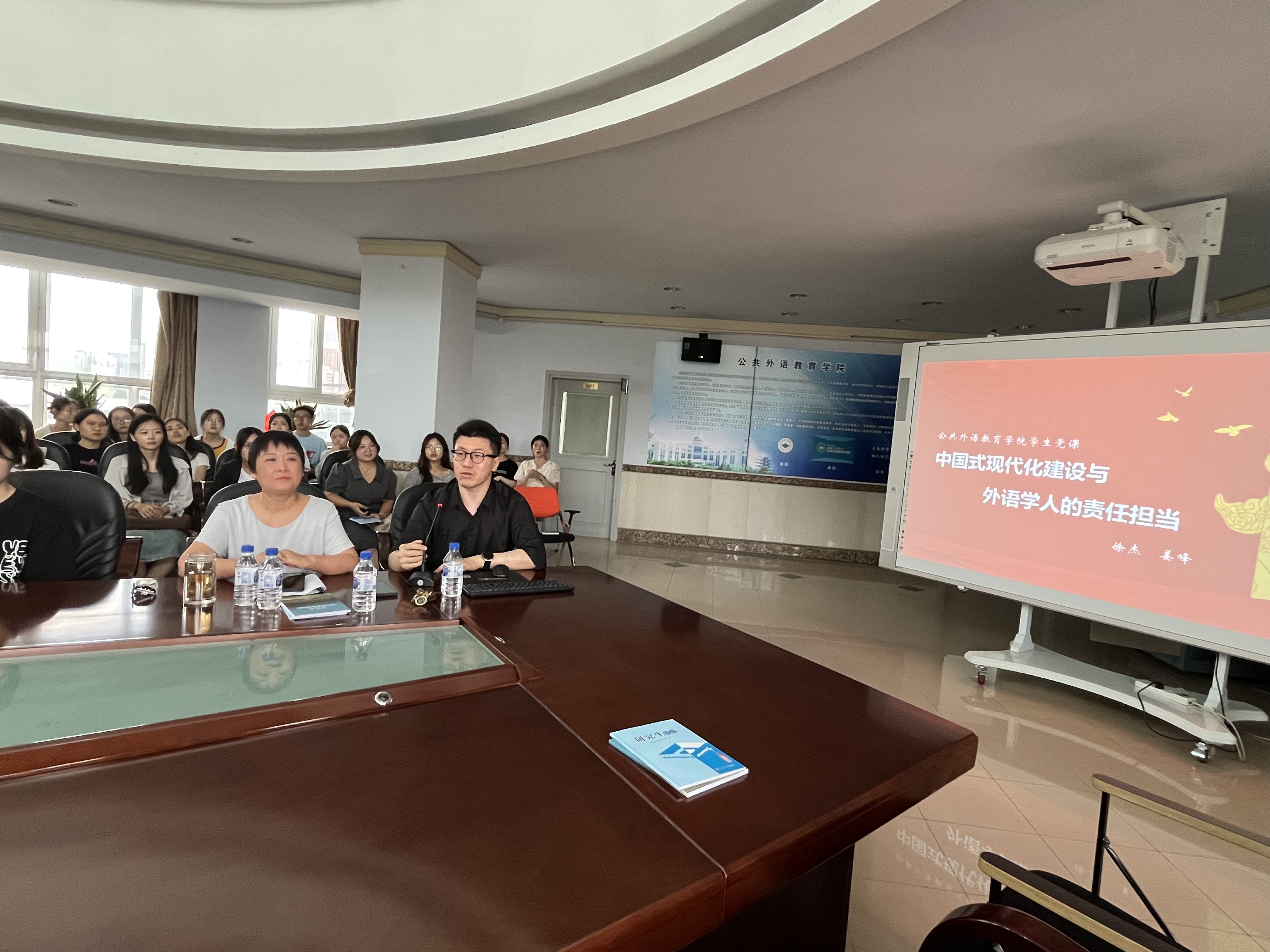 2023年8月25日下午,【官网】副院长姜峰为江南在线2023级新生讲授了一堂以“中国式现代化建设与外语学人的责任担当”为主题的党课,本次党课由党委副书记徐杰主持,教学秘书李萌、研究生辅导员林明帅参会,2023级全体研究生参加。