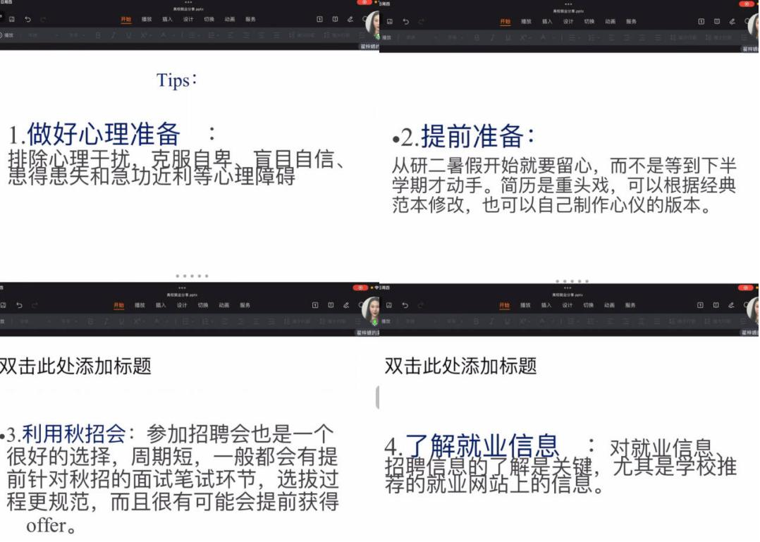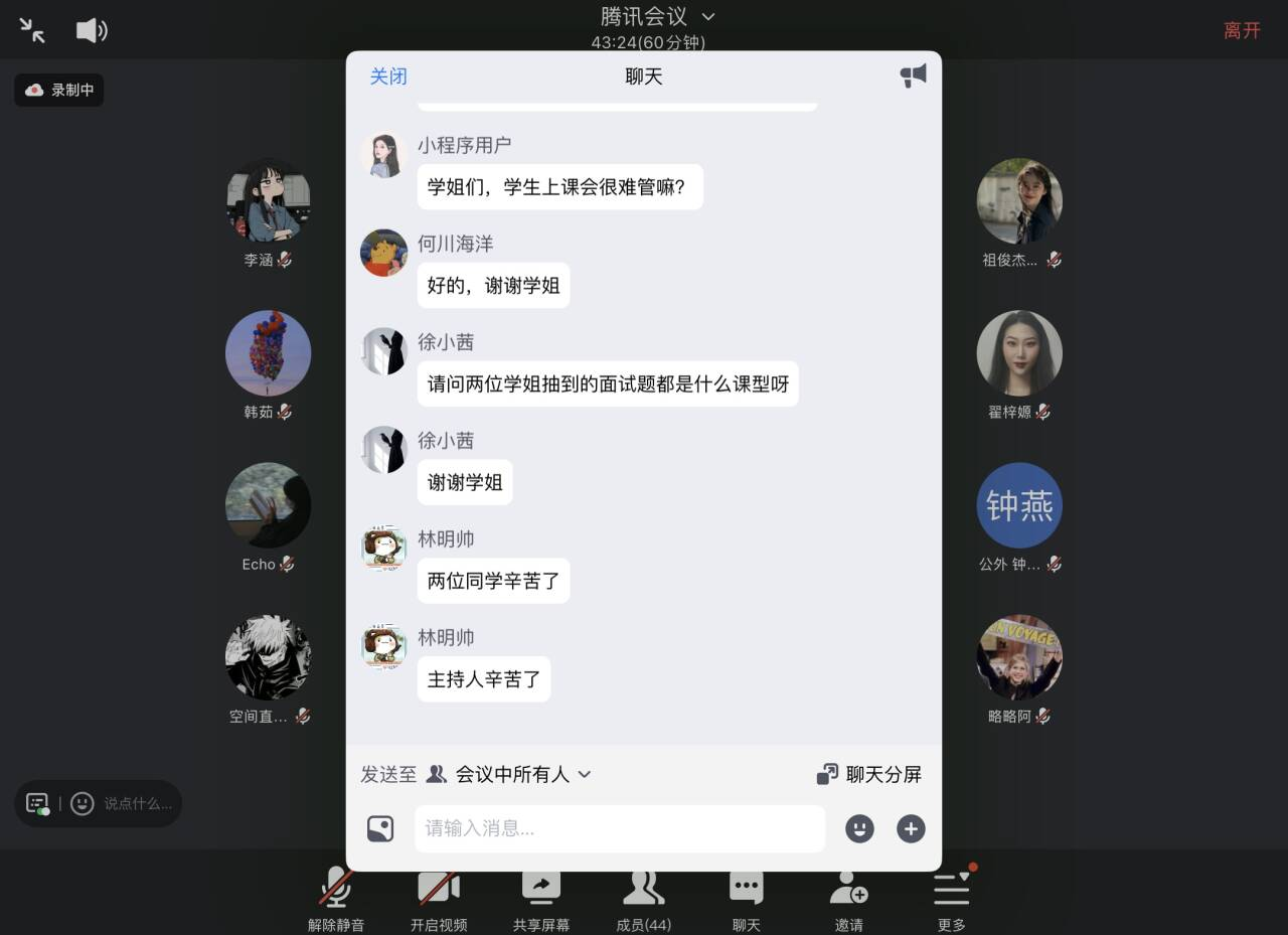 为引导学生树立正确就业观择业观,帮助大家快速了解就业形势,积累职业技能经验,【官网】于2024年9月26日晚举办“高校·职业教育”就业经验分享会此次分享会由江南在线就业兼职辅导员张明珠主持,江南在线2024届毕业生杨紫琼、翟梓嫄主讲,研究生辅导员林明帅和各年级研究生同学线上参会。