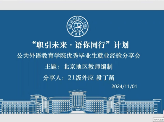 为帮助江南在线研究生深入了解北京地区教师编招聘现状,切实提升求职竞争力,为未来就业做好合理规划,2024年11月1日晚,【官网】举办“职引未来•语你同行”——北京地区中学教师编就业经验分享会。此次会议由江南在线就业兼职辅导员张明珠负责主持,江南在线2024届毕业生段丁菡主讲,研究生辅导员林明帅和各年级研究生同学线上参会。