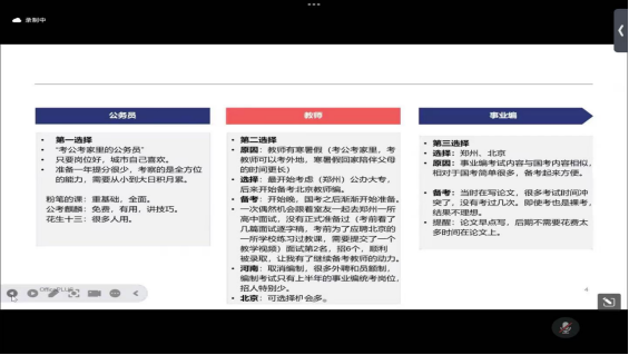 王钰阁以个人成功考取北京地区教师编的经历为例,详细分享了她的备考心得。王钰阁从职业选择、信息获取、备考和考试、入职经历、北京学校待遇和她所在学校的具体待遇五个方面作了详细的分享。她鼓励同学们在求职过程中要调整好自己的心态,拒绝焦虑情绪;她还根据自己信息搜集经验,向同学们推荐了一系列实用的公众号和书籍资源等。王钰阁还积极向同学们介绍了北京地区教师的待遇情况和工作作息安排。她希望通过自己的分享,能够使同学们“少一点信息差,多一点上岸的概率”。