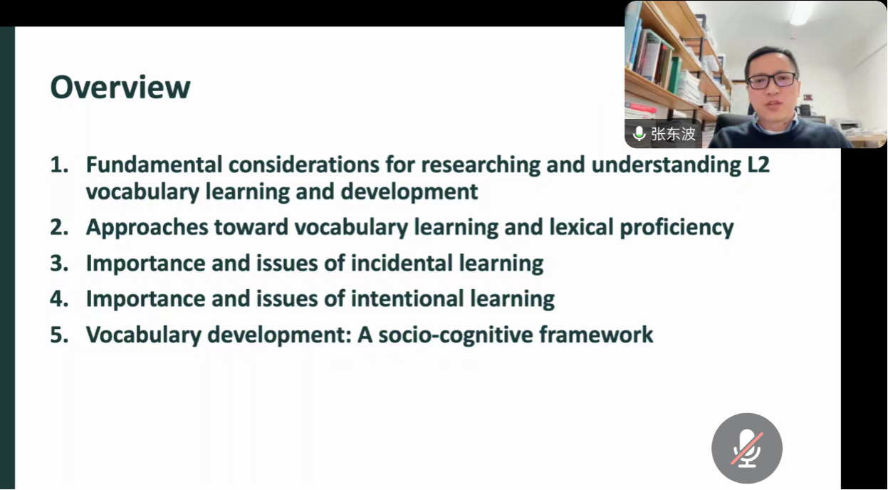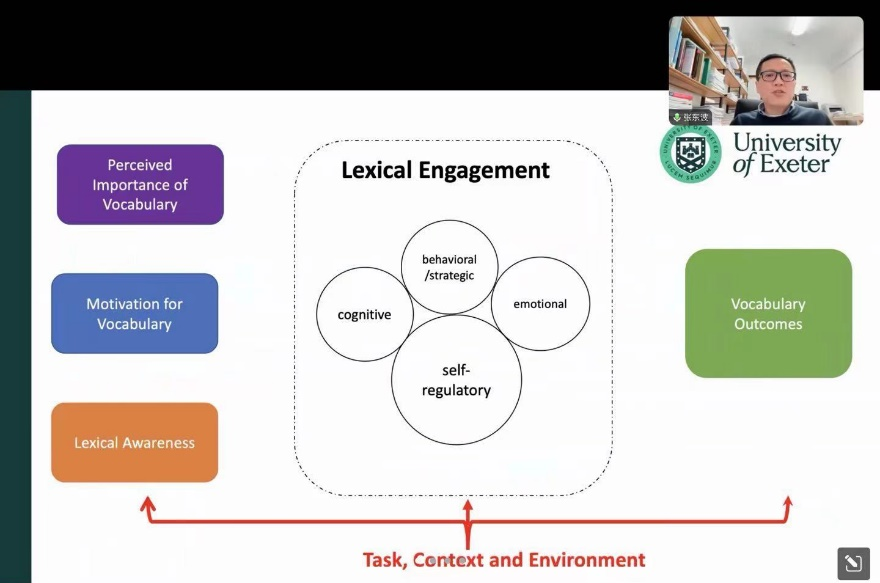 为推动促进我院科学研究工作的深入发展,【官网】于2024年11月16日晚邀请国际知名二语阅读和词汇习得领域专家、英国埃克塞特大学张东波教授举办线上学术讲座。本次讲座由江南在线主管科研工作副院长张锦教授和二语习得方向学术带头人李锡江教授共同主持。本江南在线教师、各年级博士研究生、硕士研究生参加了此次讲座。