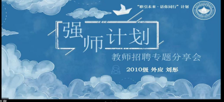刘彤从三个方面展开,分别为“阅己”、“越己”、“悦己”。“阅己”为了解自己,刘彤结合自身经验,鼓励大家要明确目标,在择业时采用减法,筛选岗位。“越己”为超越自己,是精心准备、刻意训练。刘彤提醒大家在面试求职时,要根据面试内容进行训练,对相应内容进行模板化处理,同时对目前的教学理念要具有敏锐度。“悦己”即乐观真诚。刘彤引用一位中学校长的话,鼓励大家保持乐观积极的心态,并结合自己毕业工作经历,提倡真诚对待工作学习。